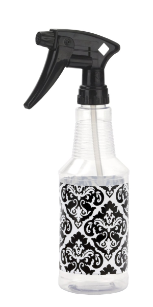 Clear PET bottle with black and white damask print graphic with black Model 220 trigger sprayer